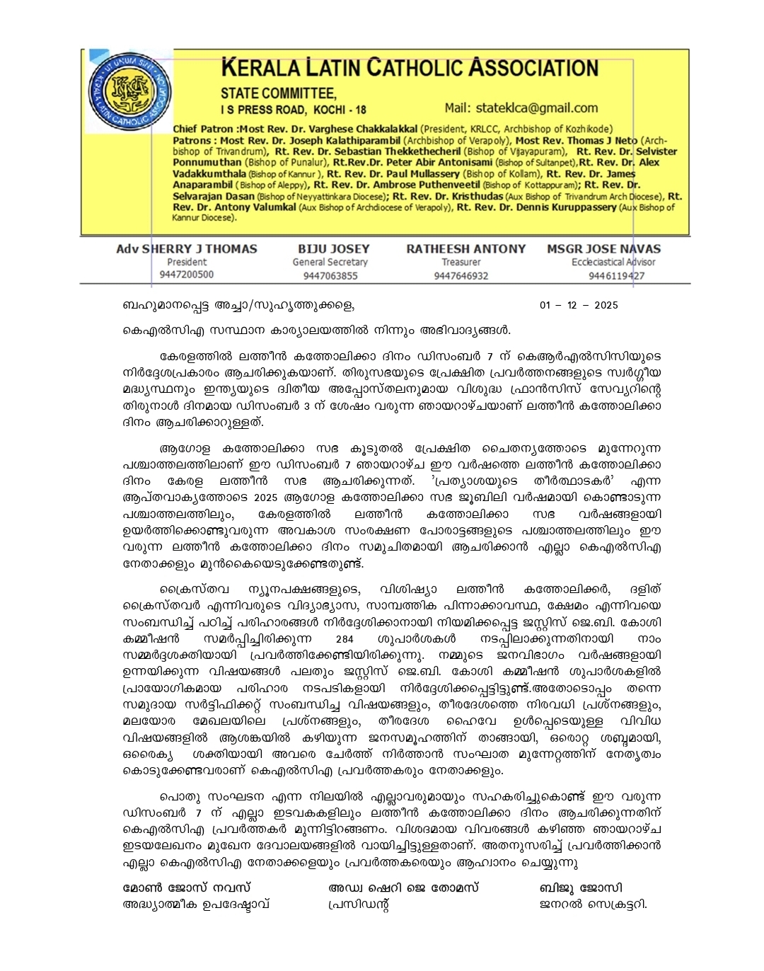 ആഗോള കത്തോലിക്കാ സഭ കൂടുതൽ പ്രേക്ഷിത ചൈതന്യത്തോടെ മുന്നേറുന്ന പശ്ചാത്തലത്തിലാണ് ഈ ഡിസംബർ 7 ഞായറാഴ്ച ഈ വർഷത്തെ ലത്തീൻ കത്തോലിക്കാ ദിനം കേരള ലത്തീൻ സഭ ആചരിക്കുന്നത്. ‘പ്രത്യാശയുടെ തീർത്ഥാടകർ’ എന്ന ആപ്തവാക്യത്തോടെ 2025 ആഗോള കത്തോലിക്കാ സഭ ജൂബിലി വർഷമായി കൊണ്ടാടുന്ന പശ്ചാത്തലത്തിലും, കേരളത്തിൽ ലത്തീൻ കത്തോലിക്കാ സഭ വർഷങ്ങളായി ഉയർത്തിക്കൊണ്ടുവരുന്ന അവകാശ സംരക്ഷണ പോരാട്ടങ്ങളുടെ പശ്ചാത്തലത്തിലും ഈ വരുന്ന ലത്തീൻ കത്തോലിക്കാ ദിനം സമുചിതമായി ആചരിക്കാൻ എല്ലാ കെഎൽസിഎ നേതാക്കളും മുൻകൈയെടുക്കേണ്ടതുണ്ട്.
