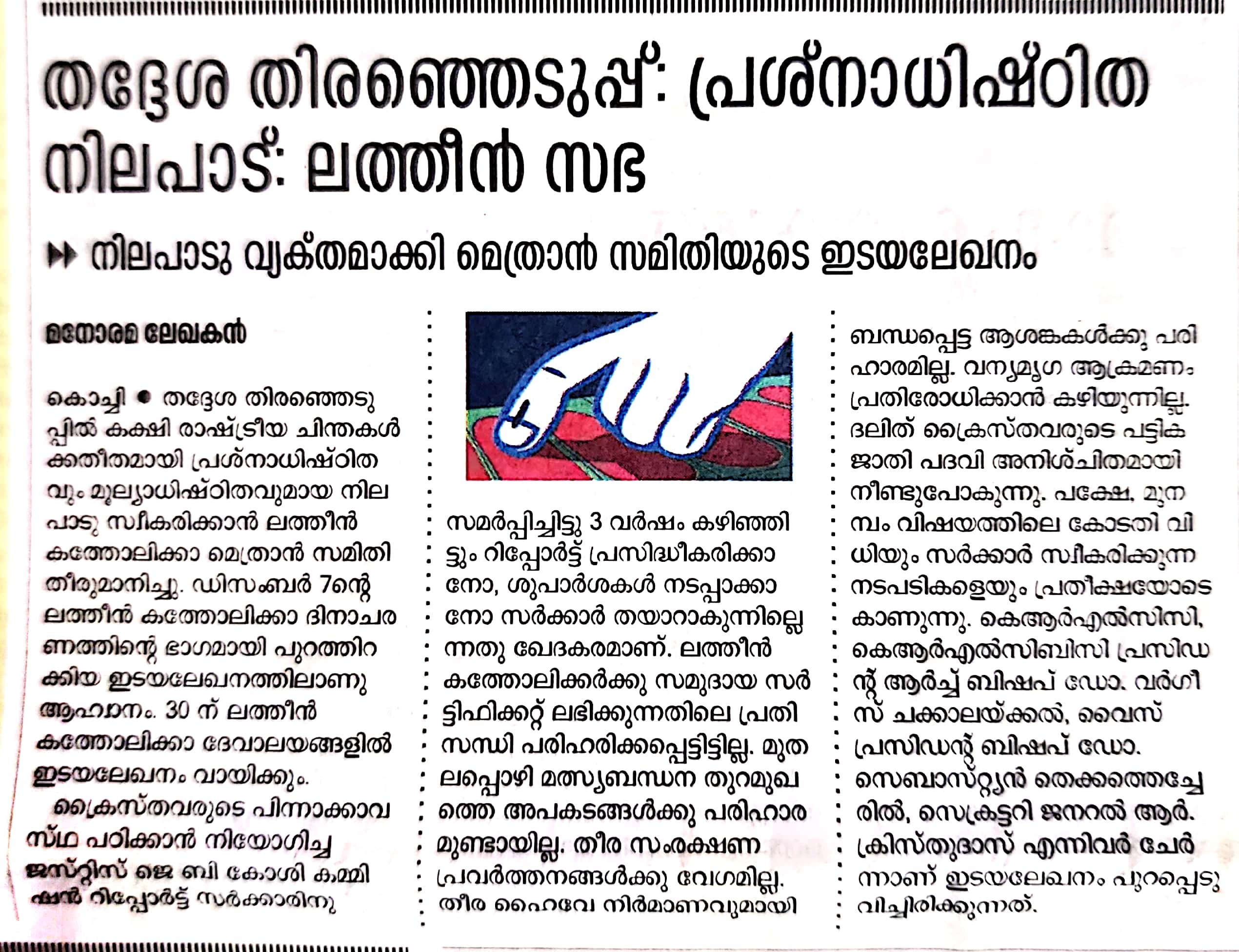 ആസമായ തദ്ദേശസ്വയം ഭരണസ്ഥാപനങ്ങളിലേക്കുള്ള തെരഞ്ഞെടുപ്പില്‍ കക്ഷിരാഷ്ട്രീയ ചിന്തകള്‍ക്കതീതമായി പ്രശ്‌നാധിഷ്ഠിതവും മൂല്യാധിഷ്ഠിതവുമായ നിലപാടെടുക്കുവാന്‍ ആഹ്വാ നം ചെയ്ത് ലത്തീന്‍ കത്തോലിക്ക മെത്രാന്‍ സമിതി. തദ്ദേശ സ്വയംഭരണ സ്ഥാപന ങ്ങളിലേക്കുള്ള തെരഞ്ഞെടുപ്പ് ഏറെ പ്രാധാന്യം അര്‍ഹിക്കുതാണ്. ജനാധിപത്യത്തെ കൂടുതല്‍ സജീവമാക്കാനും ശക്തിപ്പെടുത്താനും എല്ലാ ജനവിഭാഗങ്ങള്‍ക്കും സന്തുലിതമായ രീതിയില്‍ അധികാരത്തില്‍ പങ്കാളിത്തവും ആനുപാതികവുമായ പ്രാതിനിധ്യവും ലഭിക്കേണ്ടതുണ്ട്. വിഭജനത്തിന്‍റെയും വെറുപ്പിന്‍റെയും വെല്ലുവിളികളും പ്രതിസന്ധികളും നമ്മുടെ സമൂഹം നേരിടുമ്പോള്‍ കൂടുതല്‍ ജാഗ്രതയോടെയും ഐക്യത്തോടെയും ശക്തിയോടെയും മുന്നേറാന്‍ കഴിയണം.