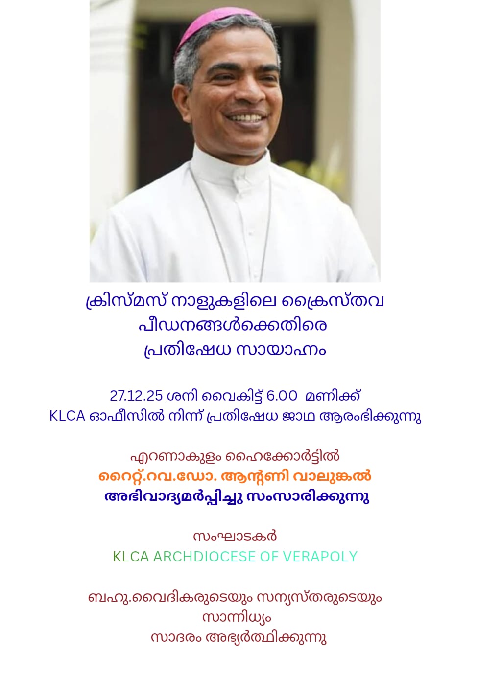 ക്രിസ്തുമസ് നാളുകളിലെ ക്രൈസ്തവ പീഡനത്തിനെതിരെ പ്രതിഷേധം – ഇന്ന് വൈകുന്നേരം ആറിന് വരാപ്പുഴ അതിരൂപത കെഎൽസിഎ ഓഫീസിൽ നിന്നും പ്രകടനവും എറണാകുളം ഹൈക്കോടതി ജംഗ്ഷനിൽ യോഗവും