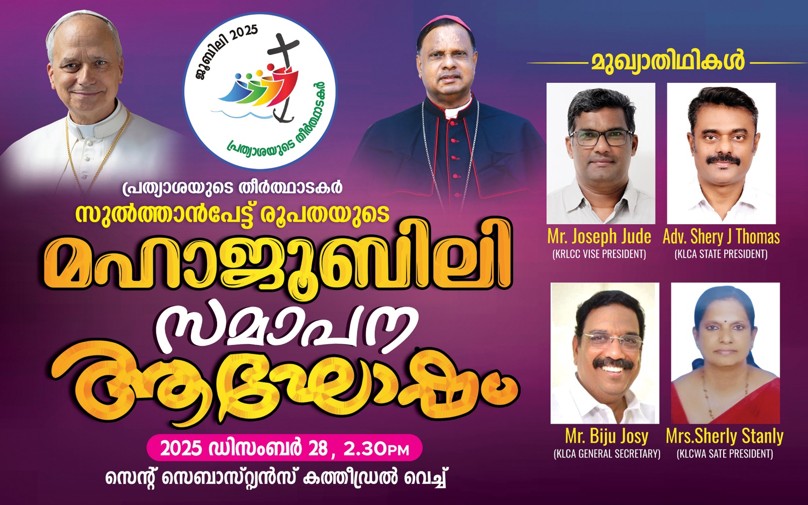 ഡിസംബർ 28ന് നടക്കുന്ന സുൽത്താൻപേട്ട് രൂപത മഹാ ജൂബിലി സമാപന ആഘോഷങ്ങളിൽ സമുദായ നേതാക്കൾ പങ്കെടുക്കും. KRLCC വൈസ് പ്രസിഡൻറ് ജോസഫ് ജൂഡ്, KLCA സംസ്ഥാന പ്രസിഡൻറ് അഡ്വ ഷെറി ജെ തോമസ്, KRLCC ട്രഷറർ ബിജു ജോസി, KLCWA പ്രസിഡൻറ് ഷേർലി സ്റ്റാൻലി എന്നിവർ പങ്കെടുക്കും.