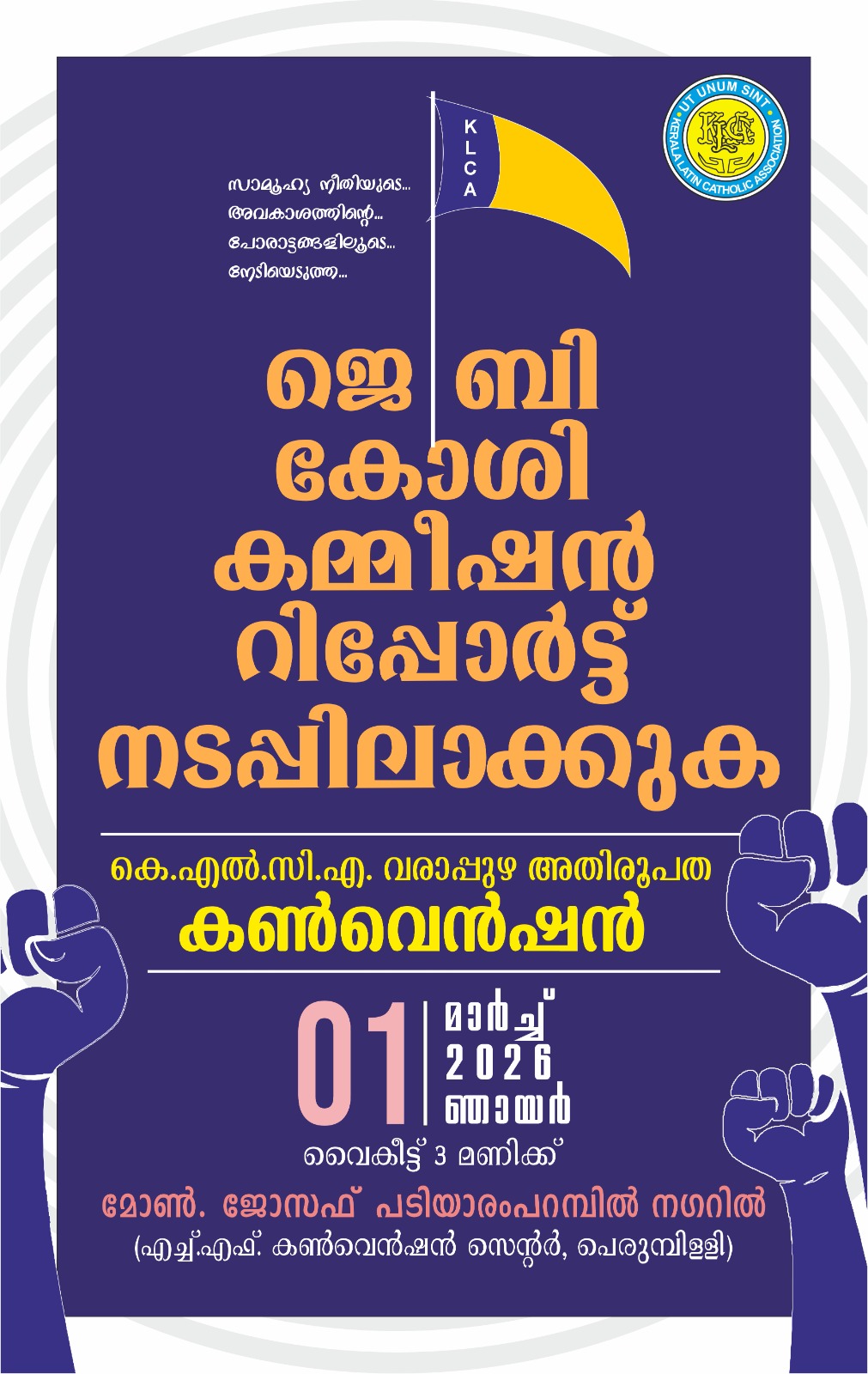 ജെ ബി കോശി ശുപാർശകൾ നടപ്പിലാക്കണമെന്ന് ആവശ്യപ്പെട്ട്  കെ  എൽ സി എ  വരാപ്പുഴ അതിരൂപത കൺവെൻഷൻ വൈപ്പിനിൽ മാർച്ച് ഒന്നിന് നടക്കും. സംസ്ഥാന വ്യാപകമായി നടക്കുന്ന നിയോജകമണ്ഡലം കൺവെൻഷനുകളുടെ ഭാഗമായാണ് വൈപ്പിൻ നിയോജകമണ്ഡലത്തിൽ വരാപ്പുഴ അതിരൂപതയുടെ നേതൃത്വത്തിൽ കൺവെൻഷൻ സംഘടിപ്പിക്കുന്നത്.