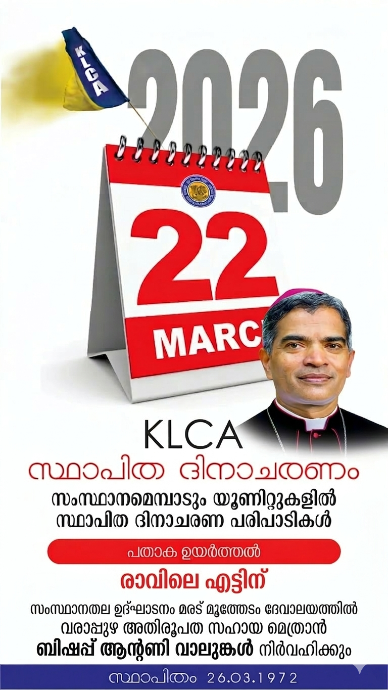 ഈ വർഷത്തെ സ്ഥാപന ദിനാചരണം - സംസ്ഥാനതല ഉദ്ഘാടനം മരട് മൂത്തേടം ദേവാലയത്തിൽ വരാപ്പുഴ അതിരൂപത സഹായമെത്രാൻ ബിഷപ്പ് ആന്റണി വാലുങ്കൽ നിർവഹിക്കും. കേരള ലാറ്റിൻ കാത്തലിക് അസോസിയേഷൻ സംസ്ഥാന അടിസ്ഥാന രൂപീകൃതമായത് 1972 മാർച്ച് 26നാണ്. മാർച്ച് 26ന് മുൻപ്…