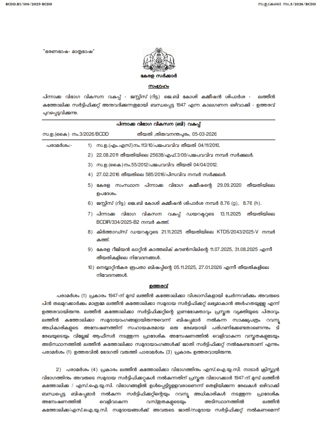 1947 നിബന്ധന നീക്കിയുള്ള സർക്കാർ ഉത്തരവ്. ജസ്റ്റിസ് ജെ ബി കോശി കമ്മീഷൻ ശുപാർശകൾ പ്രകാരവും സമുദായത്തിന്റെ നിരന്തരമായ ആവശ്യം പ്രകാരവുമാണ് ഈ ഉത്തരവ് പുറത്തിറക്കിയിട്ടുള്ളത്.